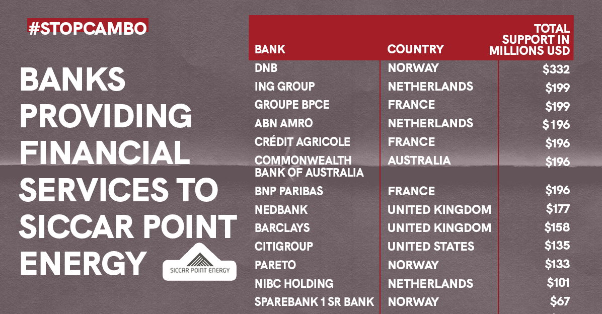 Since the Paris Agreement was signed, Siccar Point Energy has received over $2.3 billion in financial services from 14 different UK and international banks. Its biggest providers of dirty money are DNB in Norway ($332 million), ING Group in the Netherlands ($199 million), and Groupe BPCE in France ($199 million). In the UK, Barclays ($158m) and Nedbank ($177m) are the biggest creditors. Barclays was exposed as the largest backer of fossil fuels in Europe in the 2021 Banking on Climate Chaos report and contributed a staggering $145 billion in fossil fuel financing since 2015.